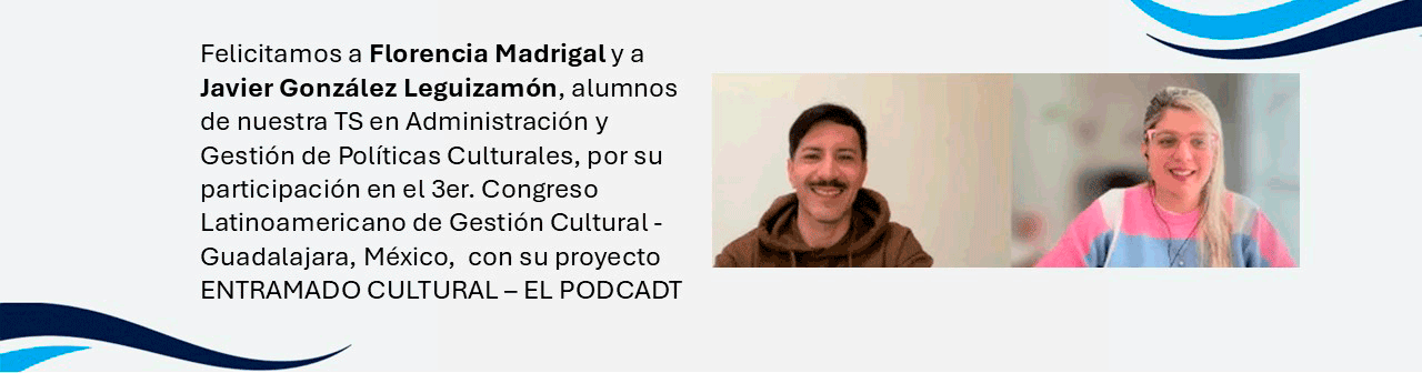 Con mucho orgullo, felicitamos a Florencia Madrigal y a Javier González Leguizamón, alumnos del 3er año de nuestra Tecnicatura Superior en Administración y Gestión de Políticas Culturales, por su participación en el 3er. Congreso Latinoamericano de Gestión Cultural. Acción Cultural para la Transformación Social - CLGC2025 (https://congreso.redlgc.com) - que se lleva a cabo en la ciudad de Guadalajara, México, del 20 al 25 de octubre del 2025, con su proyecto ENTRAMADO CULTURAL – EL PODCAST.